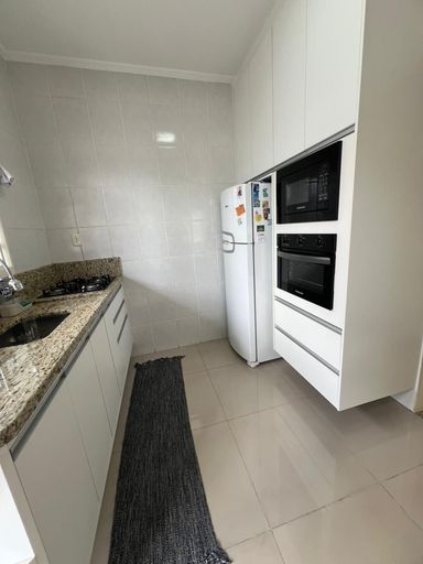 Cozinha com planejados, torre quente e fogão embutido.